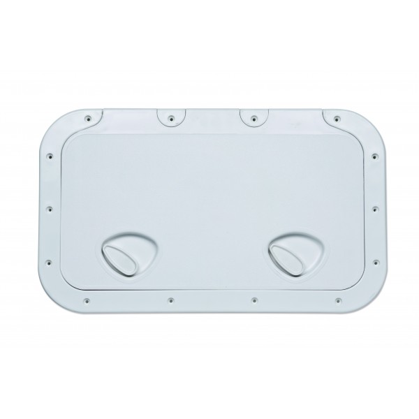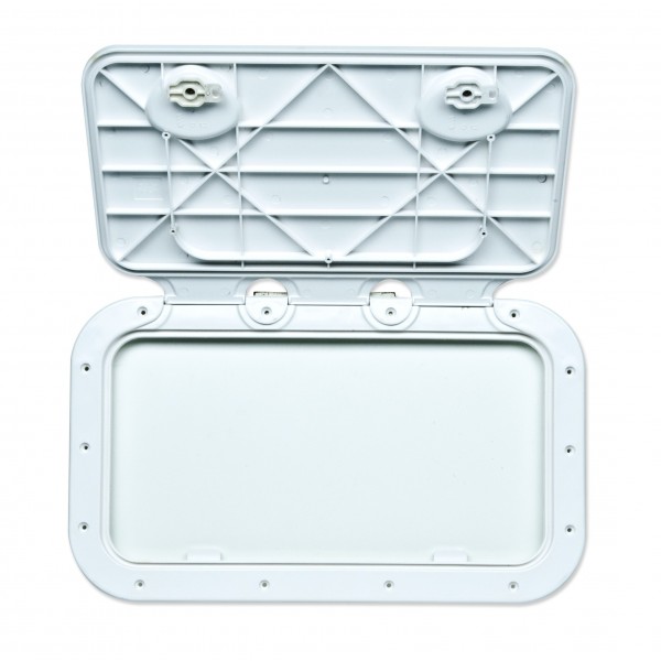 Robuste, cremefarbene Abdeckung aus UV-beständigem Kunststoff mit praktischer, herausnehmbarer Klappe. Ideal für Staufächer und Inspektionsöffnungen auf Booten und anderen Anwendungen im Außenbereich.
