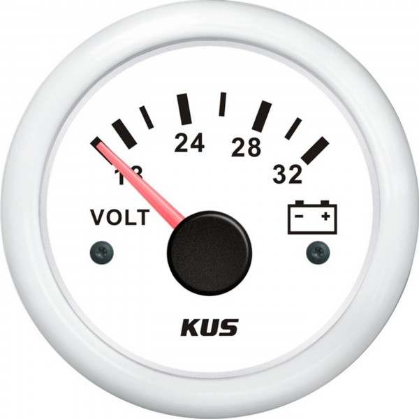 Präziser Volt-Anzeiger für 18–32 V Bordspannungen. Weißes Zifferblatt, weiße matte Einfassung, Hintergrundbeleuchtung gelb oder rot.