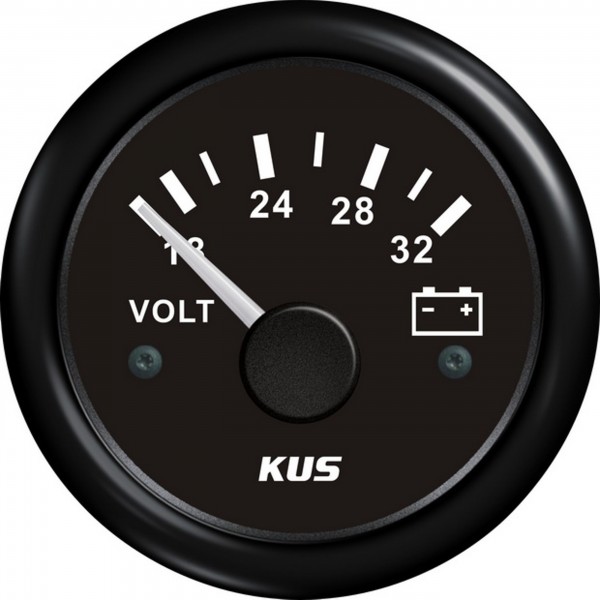 Präziser Volt-Anzeiger für 18–32 V Bordspannungen. Schwarzes Zifferblatt, schwarze matte Einfassung, Hintergrundbeleuchtung gelb oder rot.