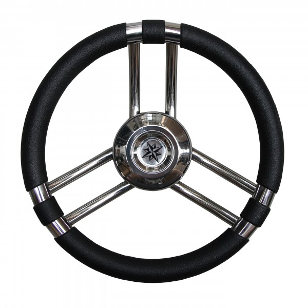 SVElegantes 350 mm Steuerrad aus Edelstahl mit drei doppelten Speichen und schwarzer, abriebfester Polyurethan-Felge – maritimes Design trifft Funktion.