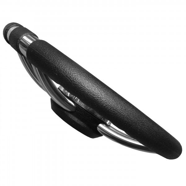 Modernes Steuerrad für Motorboote, Segelboote und Yachten, gefertigt aus hochglanzpoliertem Edelstahl AISI 316 mit drei doppelt verstärkten Speichen. Die Felge aus schwarzem Polyurethan bietet hervorragenden Grip, ist rutschfest, abriebfest und UV-beständig. Ideal für anspruchsvolle Einsätze bei jeder Wetterlage.