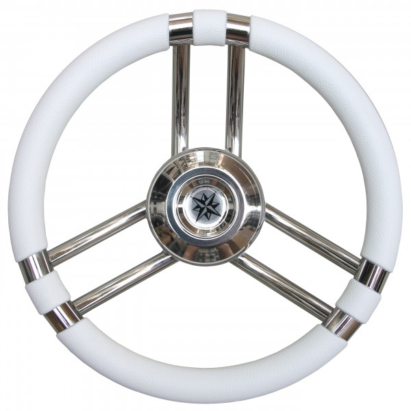 SVRobustes 350 mm Steuerrad aus Edelstahl mit drei doppelten Speichen und weißer, abriebfester Polyurethan-Felge – langlebig und stilvoll.
