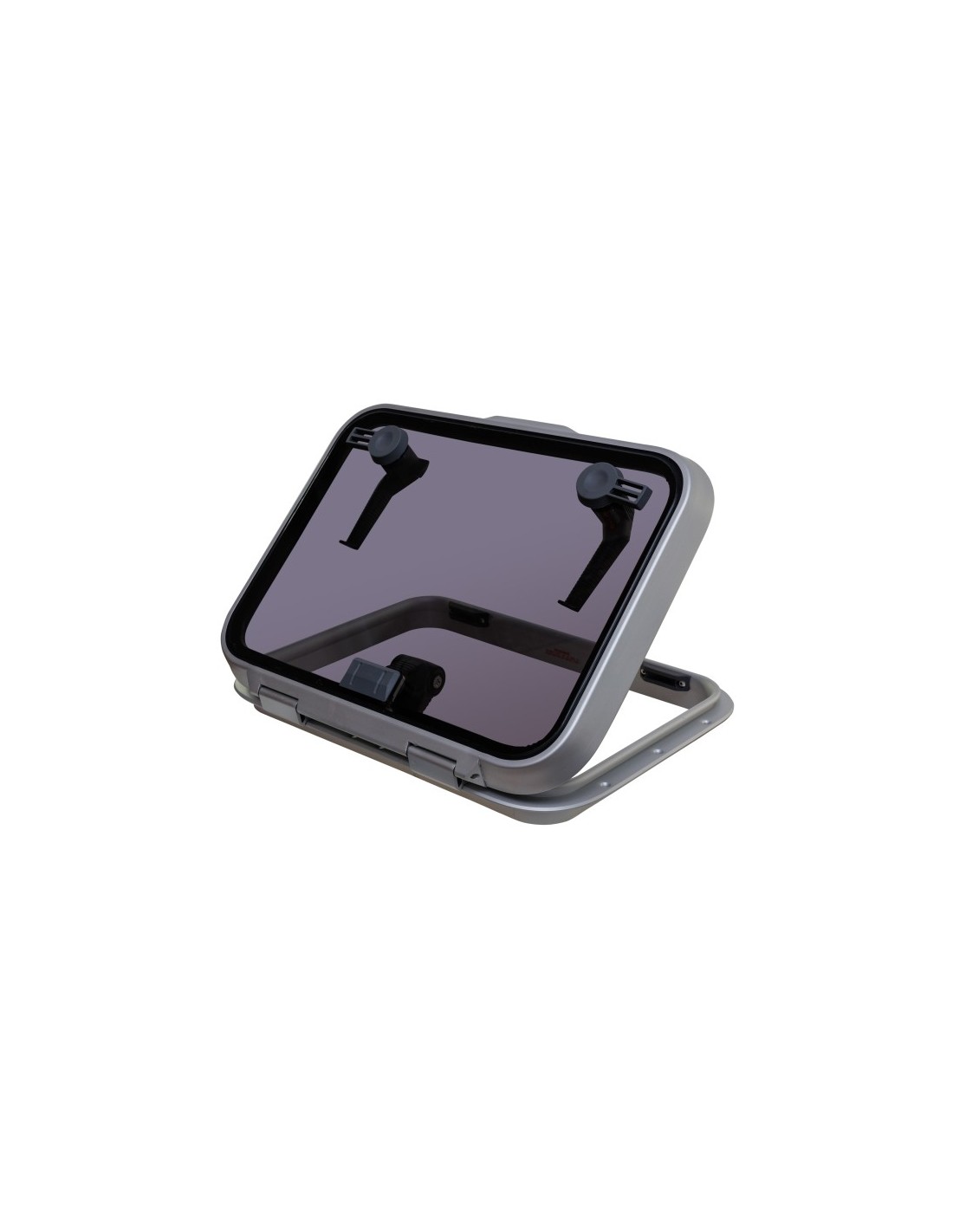 Die Luke ist für ebene Decks und Kajütaufbauten geeignet. Durch die spezielle Montage von Acrylglas und Dichtungen ist sie hochwasserbeständig. Die Schiebehebel ermöglichen das Halten der Luke in jedem Winkel bis maximal 95 Grad.