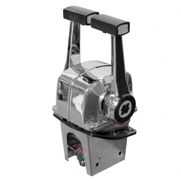 Hochwertiger Doppel-Schalthebel von MaviMare für zwei Motoren mit integrierter Trim-Funktion. Gefertigt aus korrosionsbeständigem, verchromtem Aluminium, geeignet für den bündigen Einbau (Flush Mount) in Cockpit oder Steuerkonsole. Kompatibel mit den meisten Steuerkabeln.