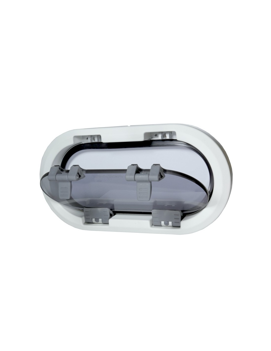 Öffnendes Lewmar Standard 1 RE Portlight mit silbernem Außenrahmen, weißem Innenrahmen aus ABS-Kunststoff und getöntem Acrylglas. Rechte Ausführung (RE).
