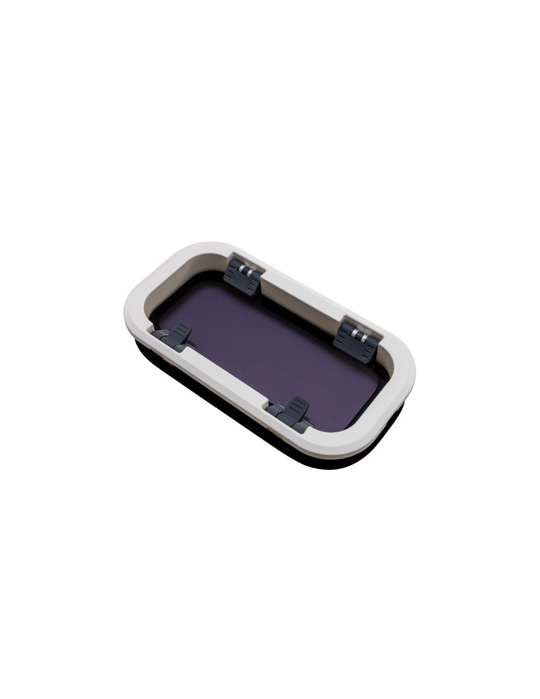 Öffnendes Lewmar Standard 1 Portlight mit schwarzem Außenrahmen, weißem Innenrahmen aus ABS-Kunststoff und getöntem Acrylglas. Klassisches, zuverlässiges Bootsfenster für Yacht und Boot.